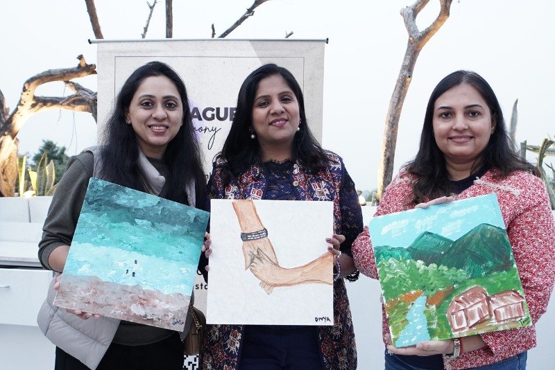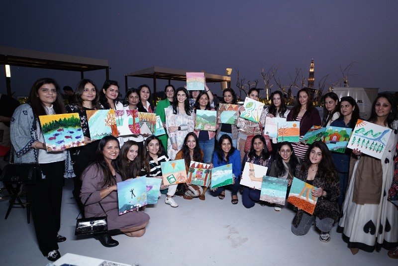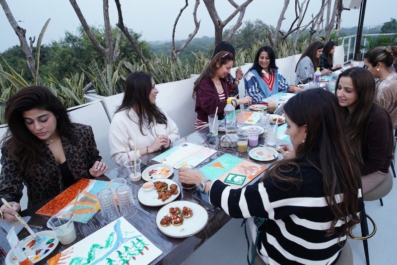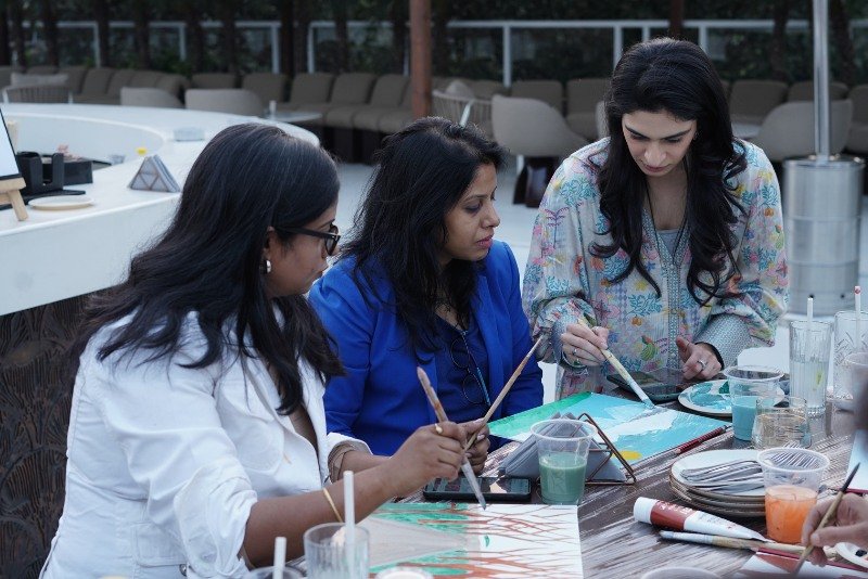 Sana gently guided participants through the painting process, encouraging them to move beyond perfection and simply enjoy the meditative flow of brushstrokes. With music, conversation, and creativity in the air, the event became a soulful mix of art therapy, joyful expression, and shared laughter – fostering emotional release and authentic connection.